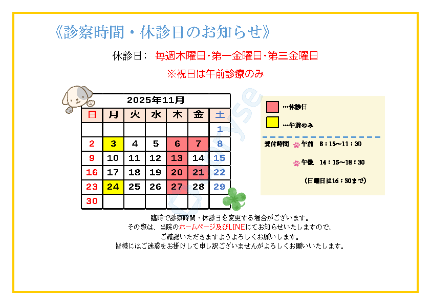 2025年10月29日 / 最終更新日 : 2025年10月29日 とちのき動物病院 院からのお知らせ 11月の診療日程について 11月の日程は、以下の通りです。 変更などありましたら、お知らせいたします。 ※6日(木)~7日(金)、20日(木)~21日(金)は連休になります。 また3日(月)、24日(月)は祝日のため午前診療のみになります。 ご注意ください。 ※追記※ 11/1(土)、午前中緊急手術のため院長指名での診察はお受けできません。 院長指名での診察をご希望の方は、午後よりお受けいたします。 ご不便をおかけしますが、ご理解の程よろしくお願い申し上げます。 Follow me! FacebookXBlueskyHatenaCopy